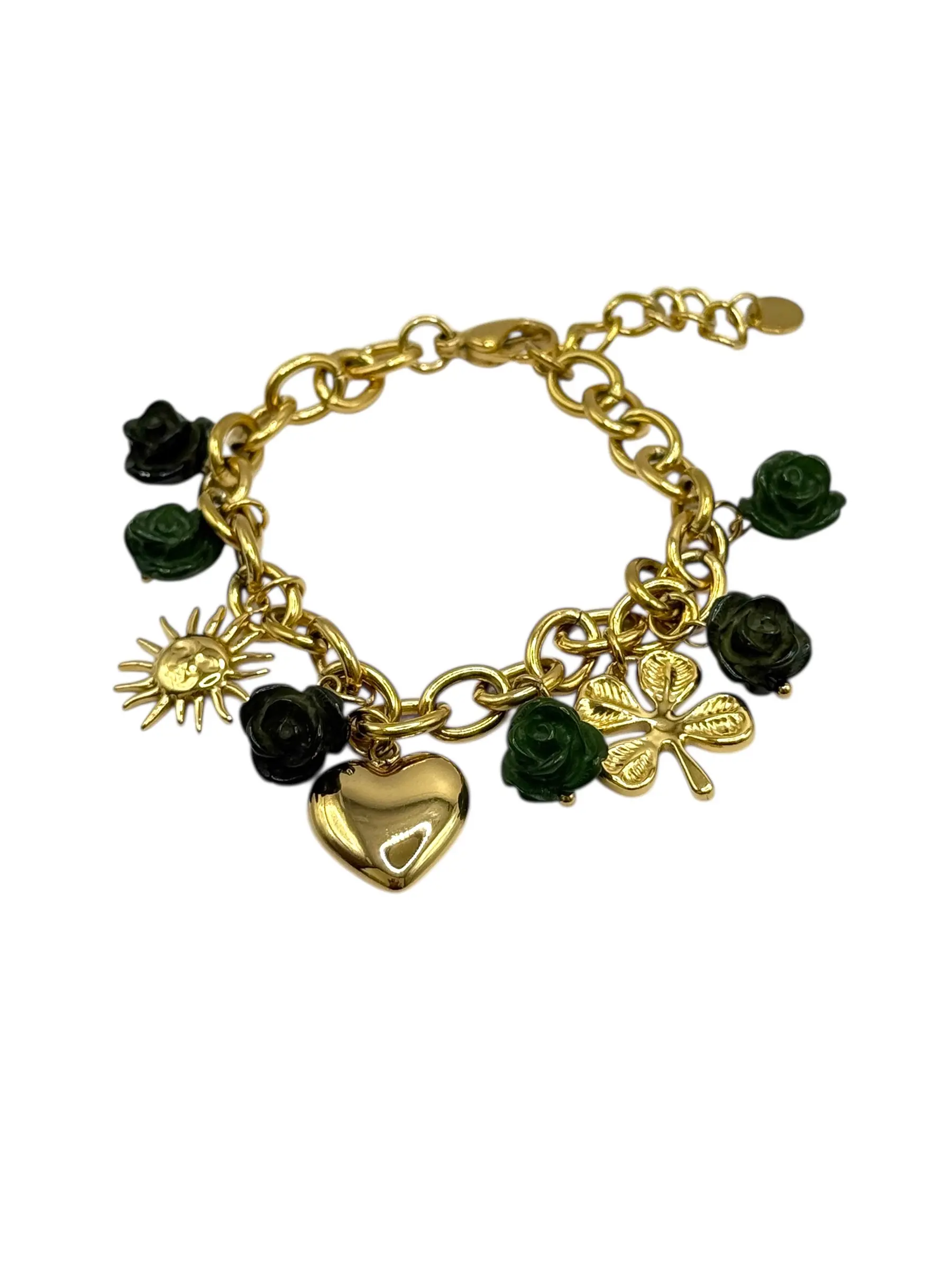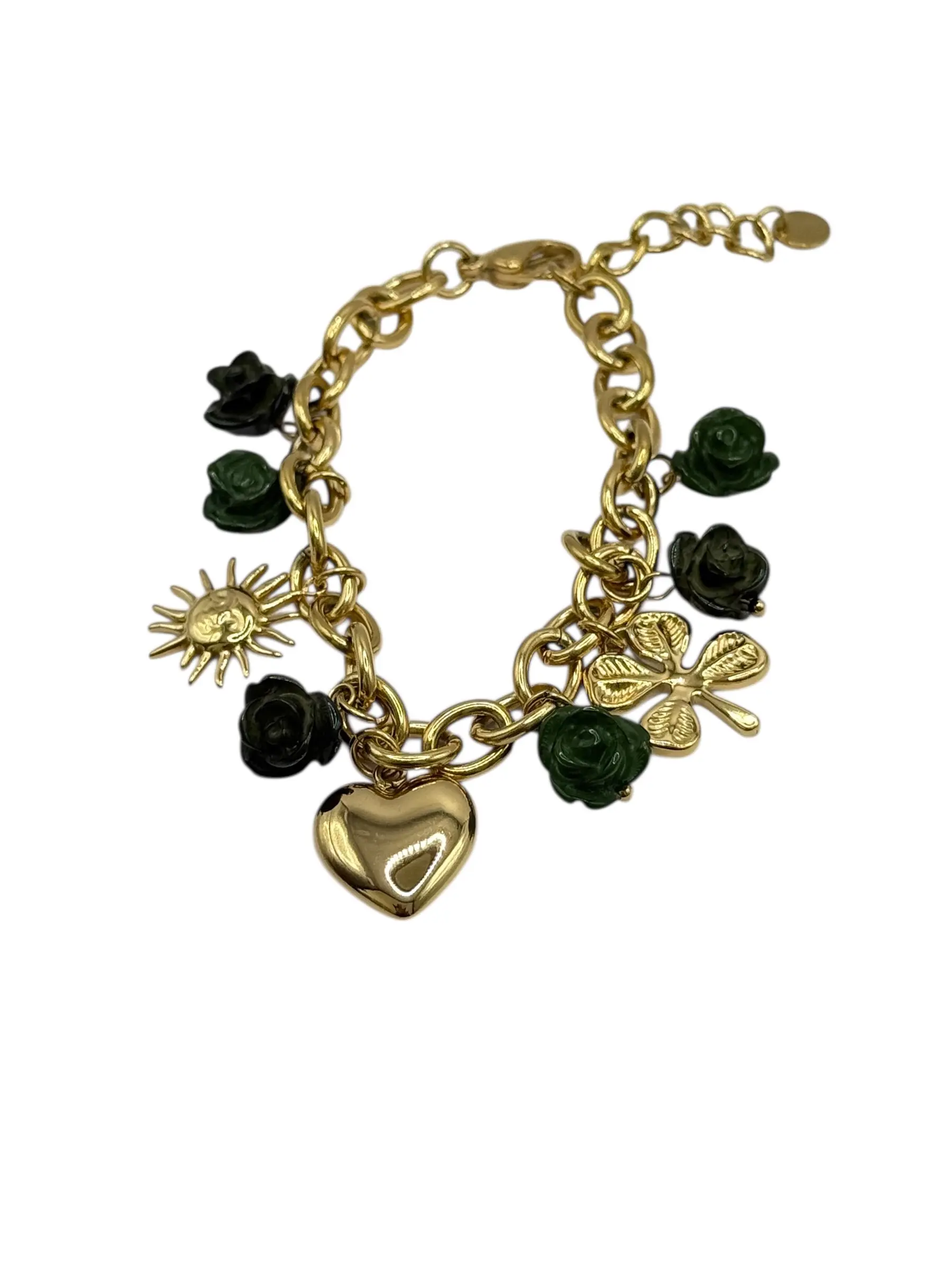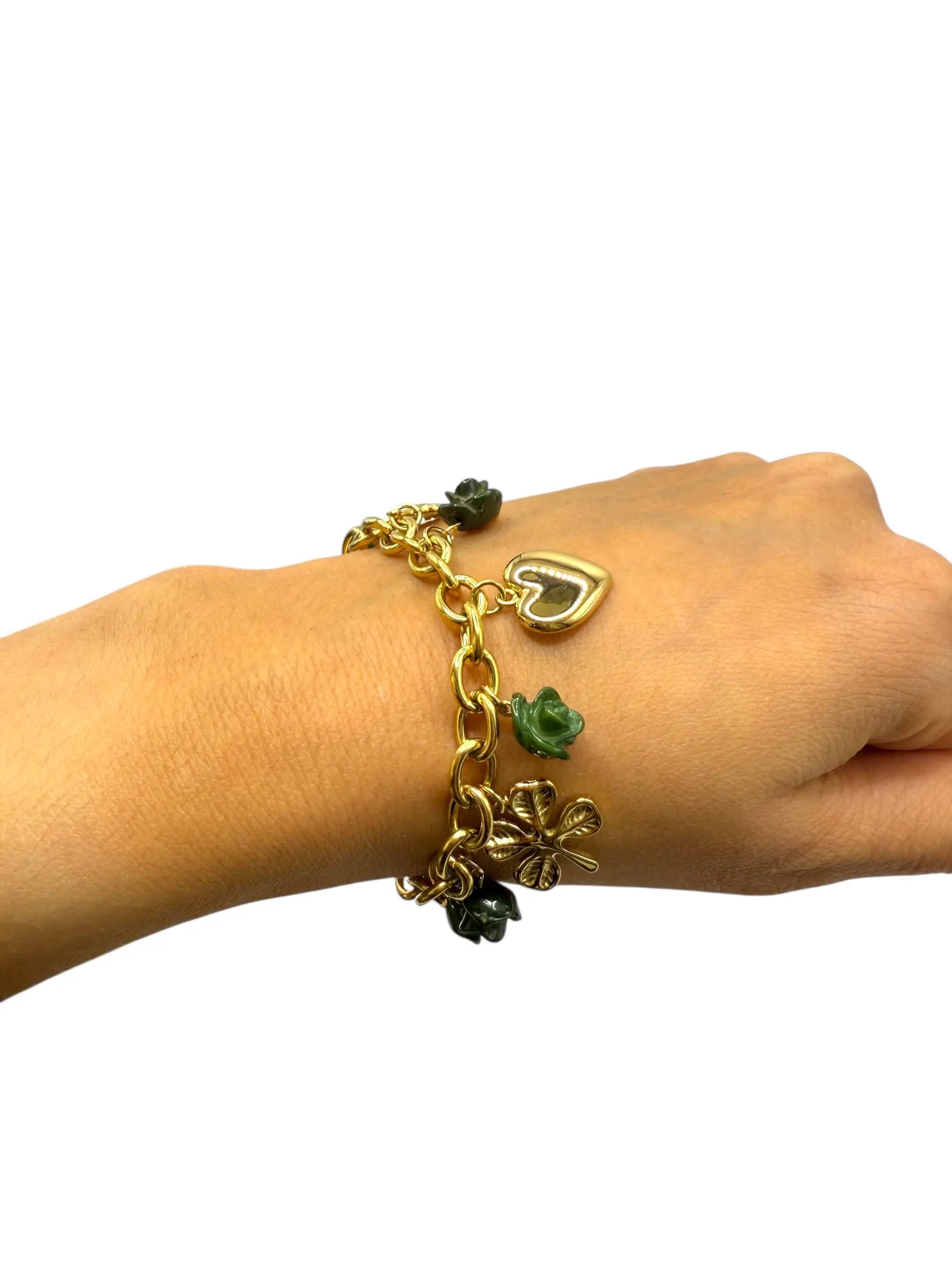 Laissez-vous séduire par ce bracelet breloques cœur doré fleurs vertes unique, pensé pour celles qui aiment mêler féminité, modernité et sens du détail. Conçu en acier inoxydable doré, il allie robustesse et élégance. Les breloques, composées d’un cœur doré et de fleurs vertes stylisées, apportent une note organique, raffinée et rafraîchissante.