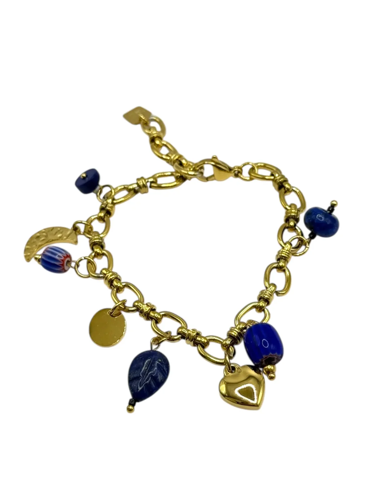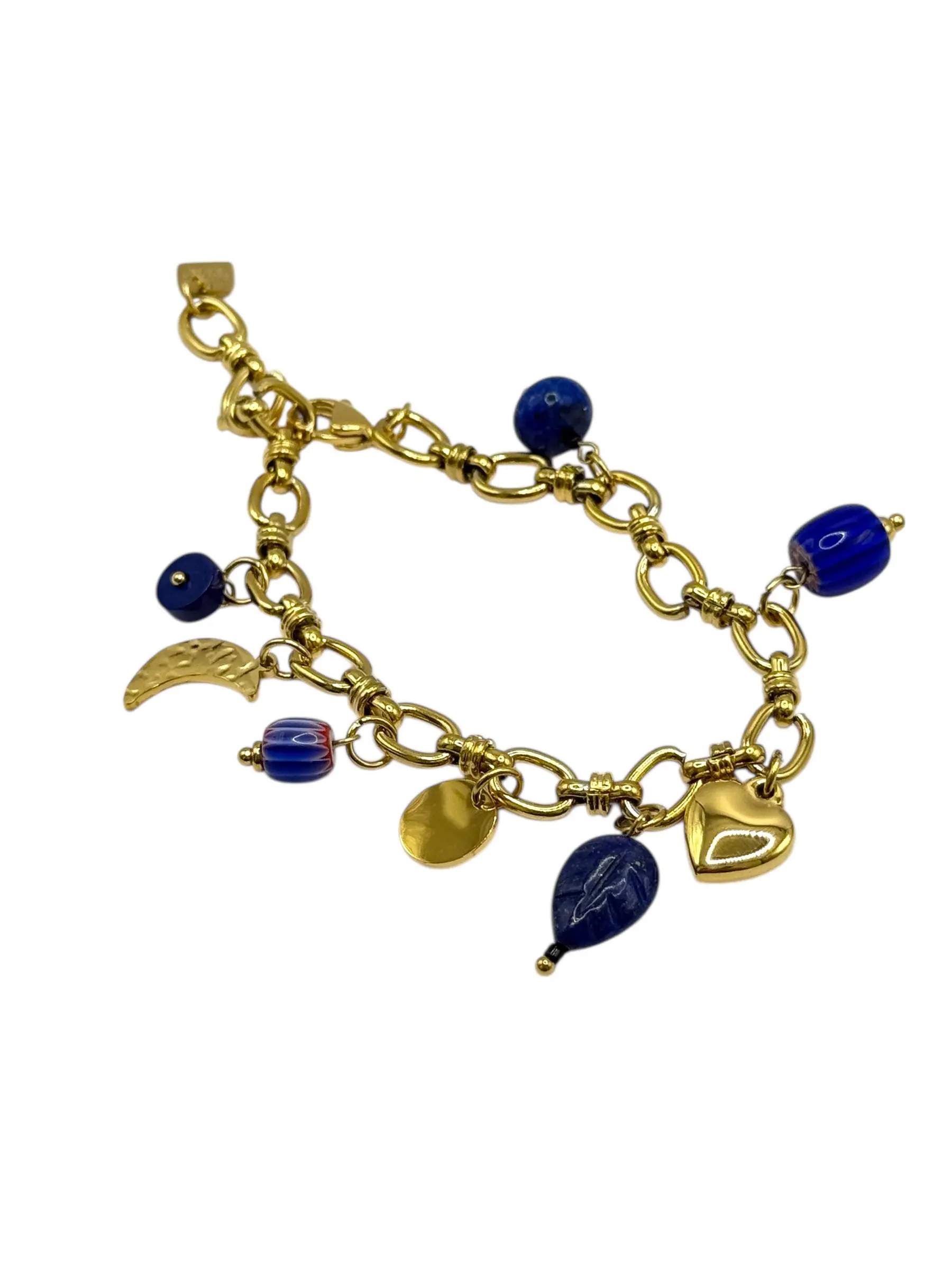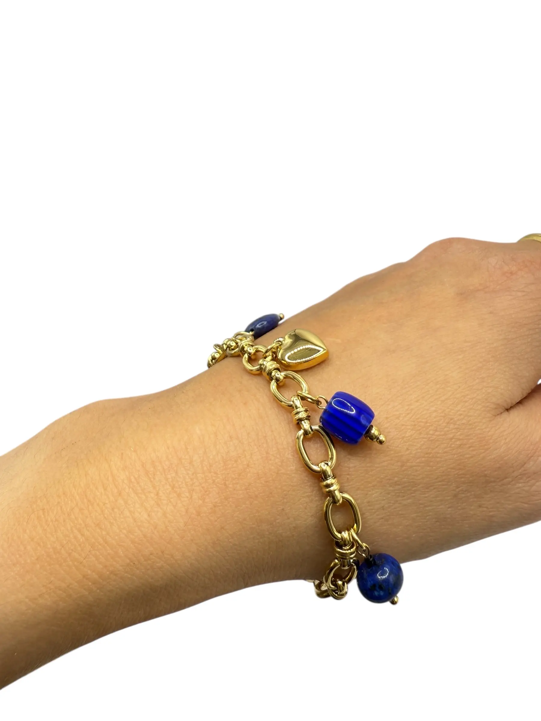 Apportez une touche lumineuse à votre poignet avec ce bracelet en acier inoxydable doré, doté d’un charm cœur et de perles bleu marine profondes — élégant, durable et parfait pour sublimer vos tenues.