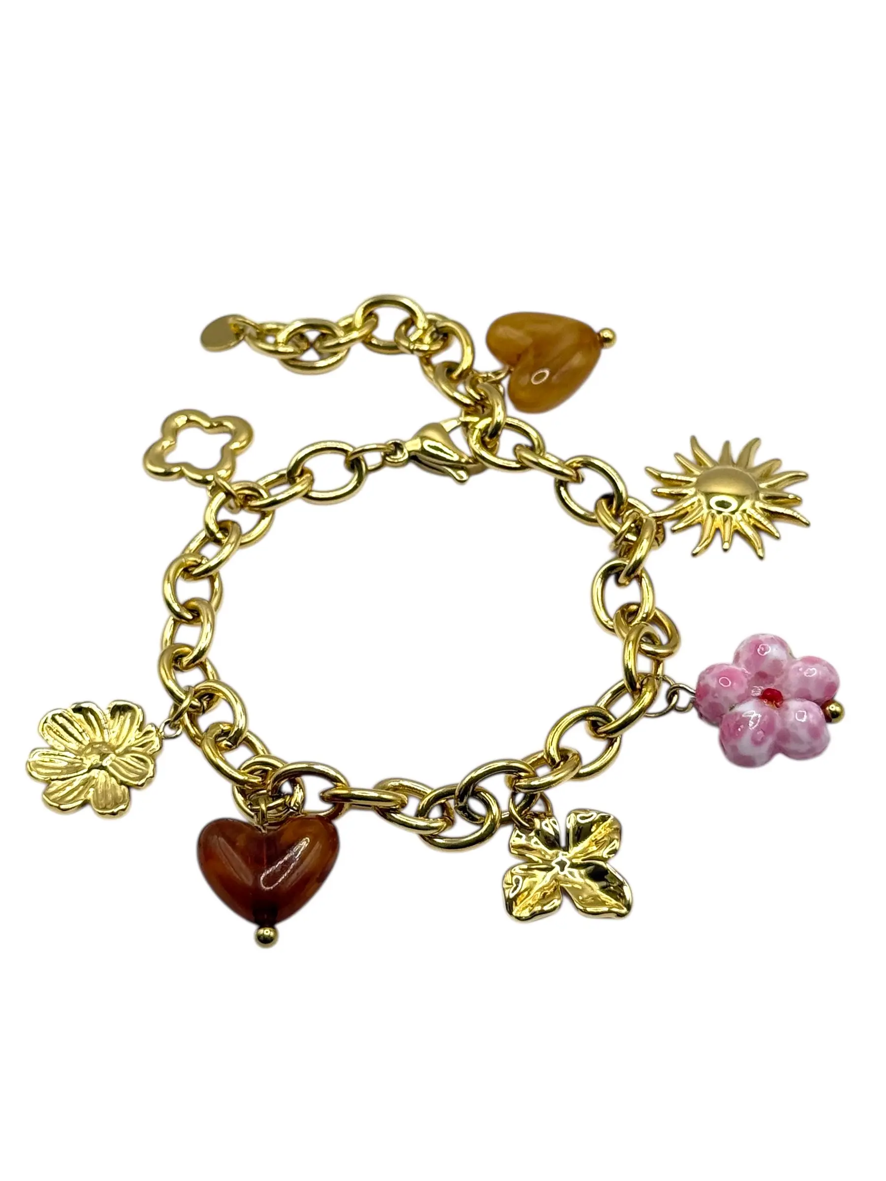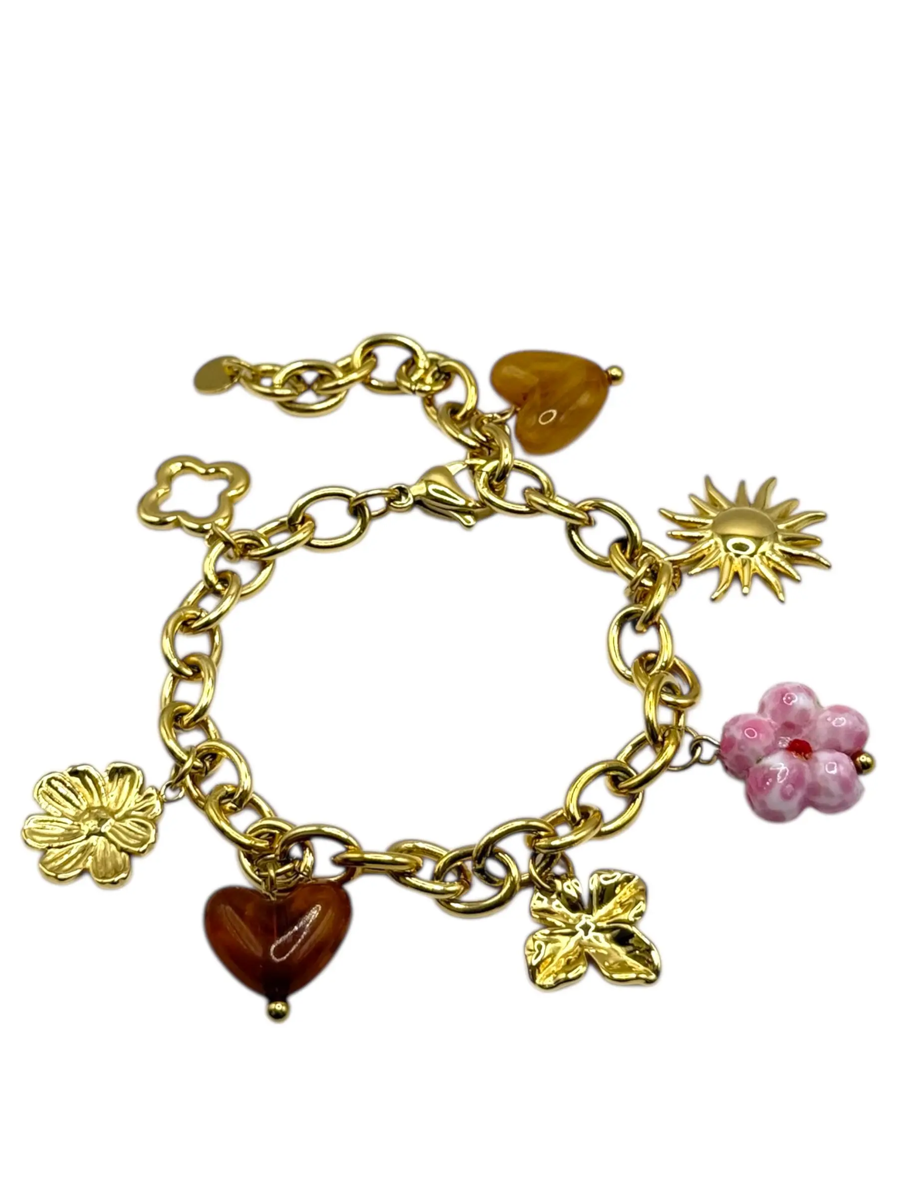 Ajoutez une touche lumineuse à votre poignet avec ce bracelet acier inoxydable doré, breloques fleurs dorées & cœurs ambrés. Un bracelet femme élégant en acier inoxydable doré, composé de breloques soleil, fleurs et cœurs ambrés : un accessoire chic et lumineux pour tous les jours.