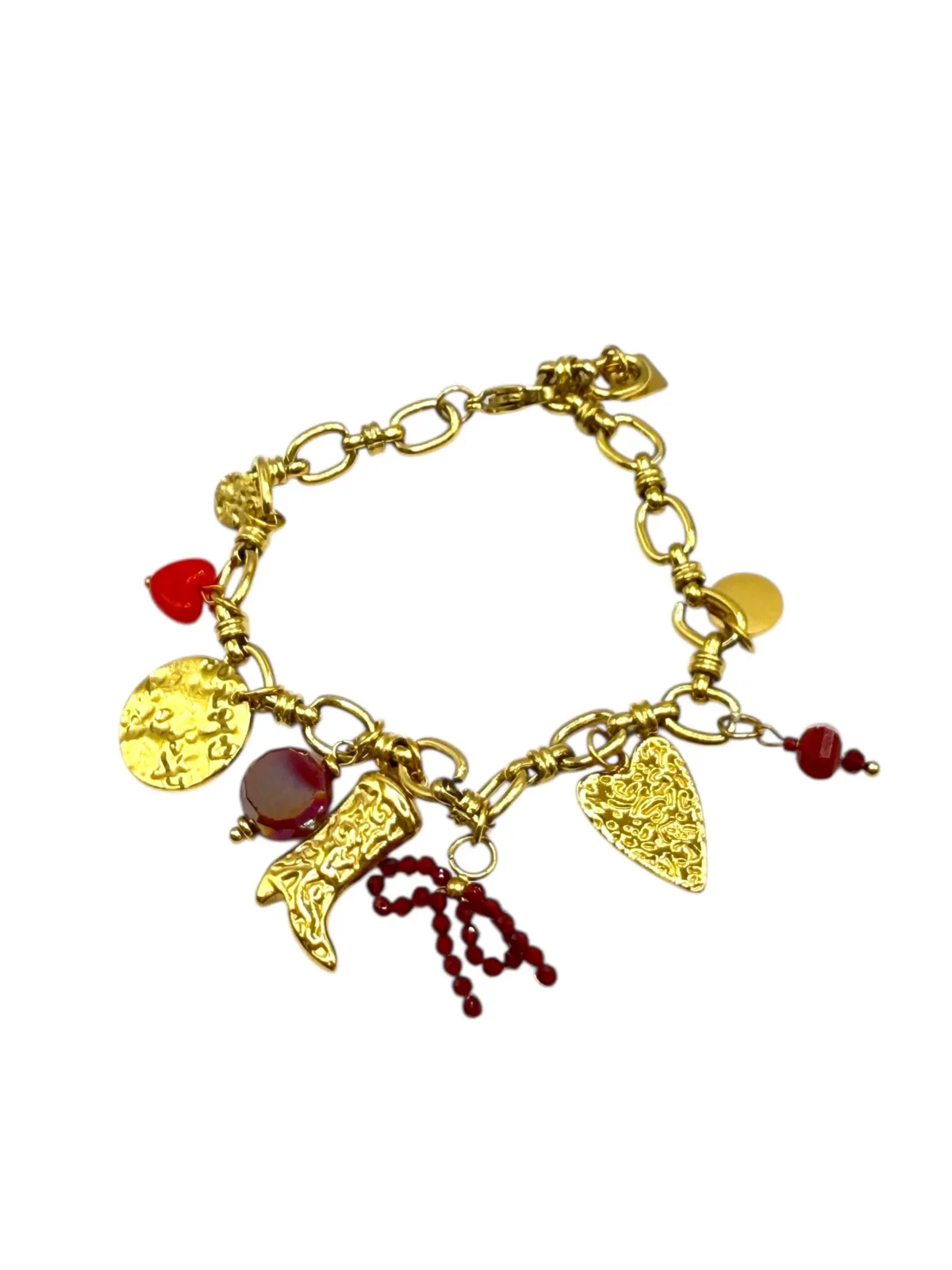 Breloques : un charm bottine texturé, un charm cœur doré gravé, et des perles rouges facettées et rondes. Une palette rouge doré qui attire le regard.